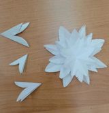 - Необходимо подготовить три круга разного диаметра. Сложить каждый вырезанный круг пополам в три раза, сделать внутренние надрезы вдоль вырезанных изогнутых линий по правую и левую сторону. Развернуть и снежинка готова.